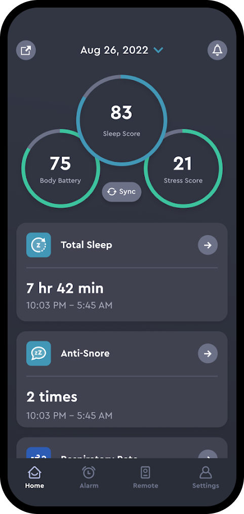 Unsere proprietäre Schlaf-Tracking-Technologie erstellt nächtliche Schlafberichte, einschließlich detaillierter Atem- und Herzfrequenzanalysen, Tief- und Leichtschlafzeiten, Anti-Schnarch-Kontrolle und mehr, alles auf Knopfdruck.